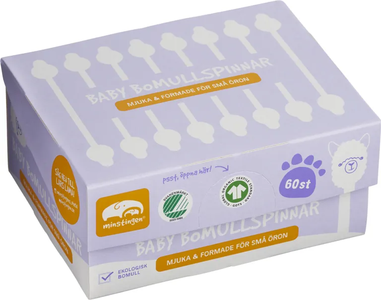 Mjuka bomullspinnar tillverkade av 100% ekologisk bomull, odlad helt utan kemikalier. Våra bomullspinnar är formade för din vildings små öron.