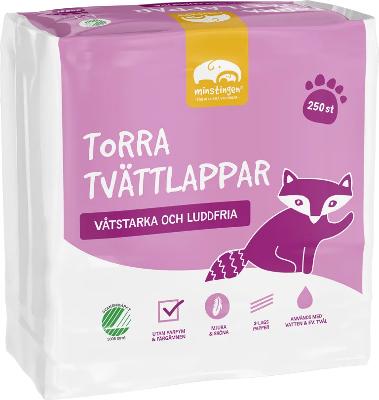 Torra tvättlappar för skonsam rengöring av din vildings ömtåliga hud. Våra tvättlappar är våtstarka och luddfria, används med vatten och eventuellt tvål. Tillverkade utan parfym och färgämnen.